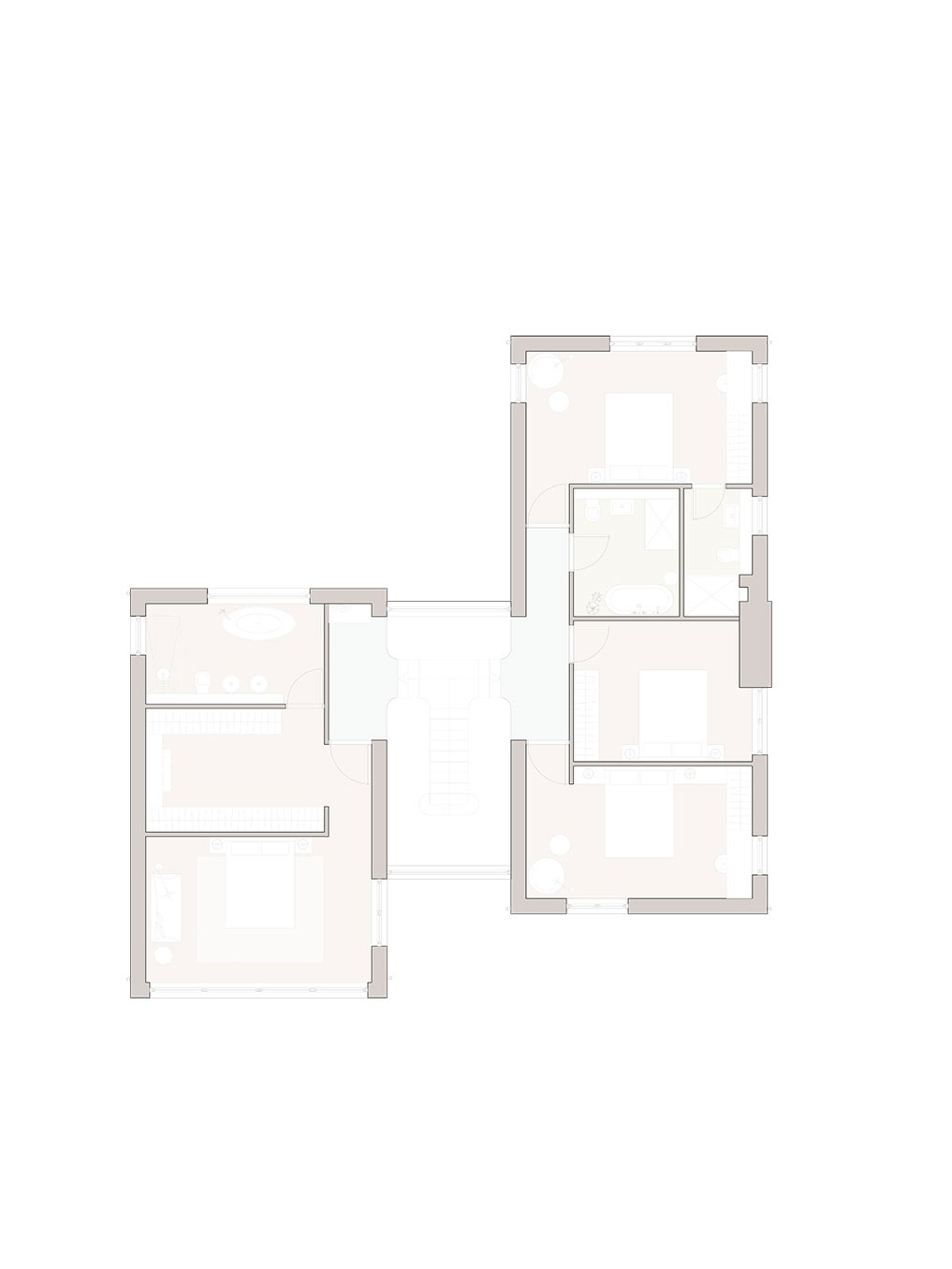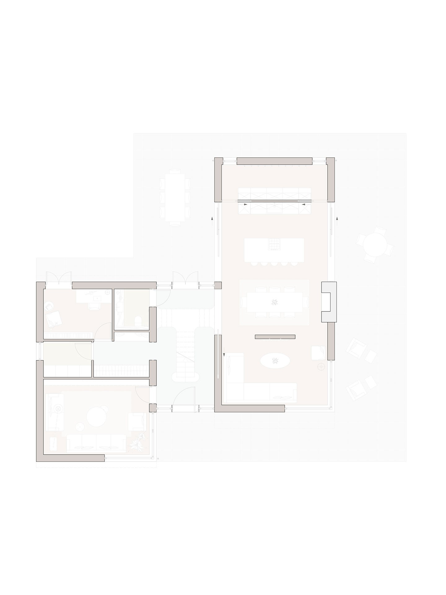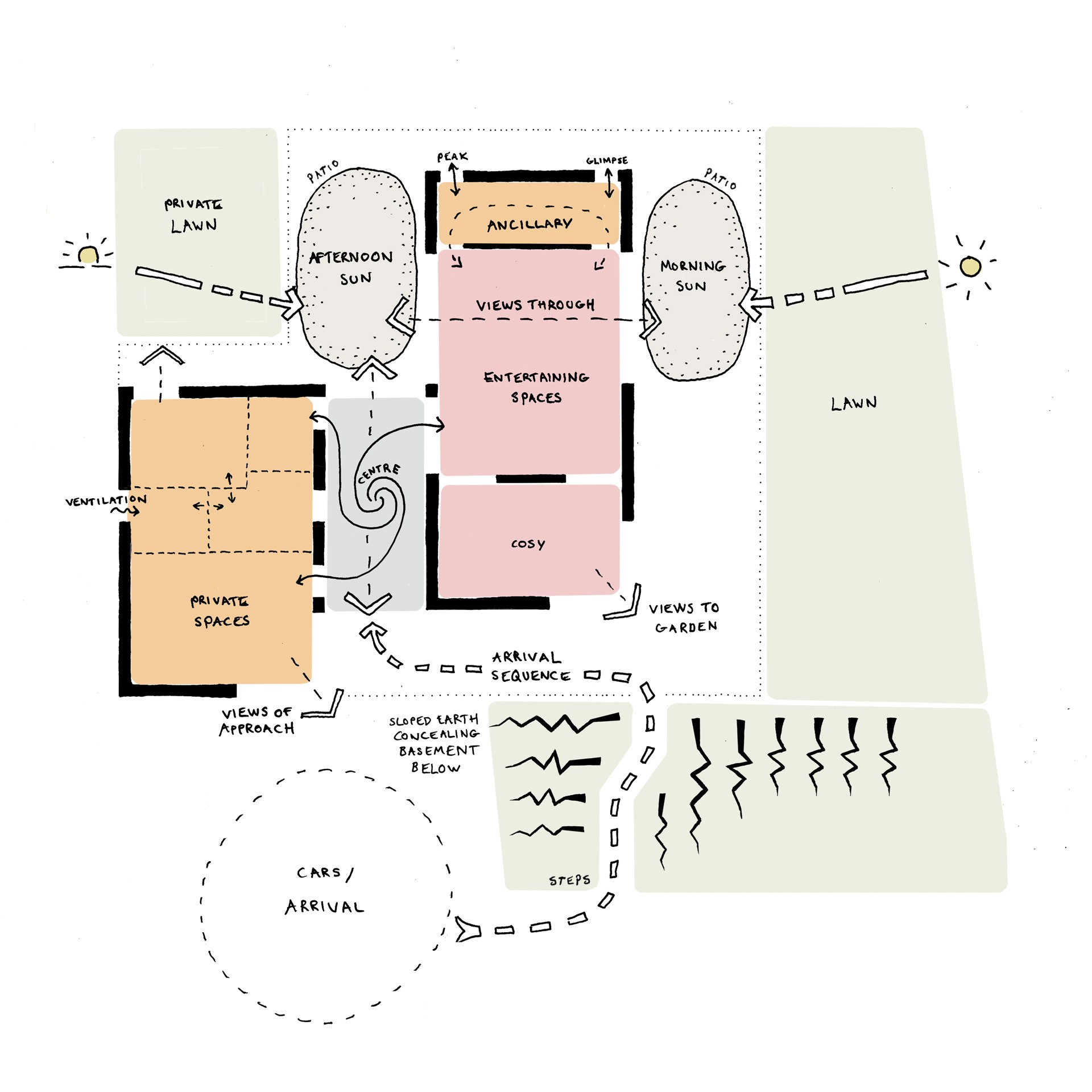 The 'wings' are stepped in plan to provide morning and evening terraces, carefully positioned to respond to the sun path across the site.