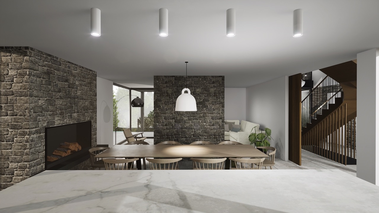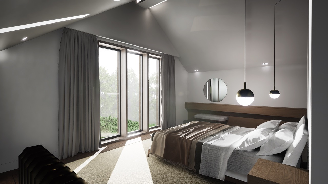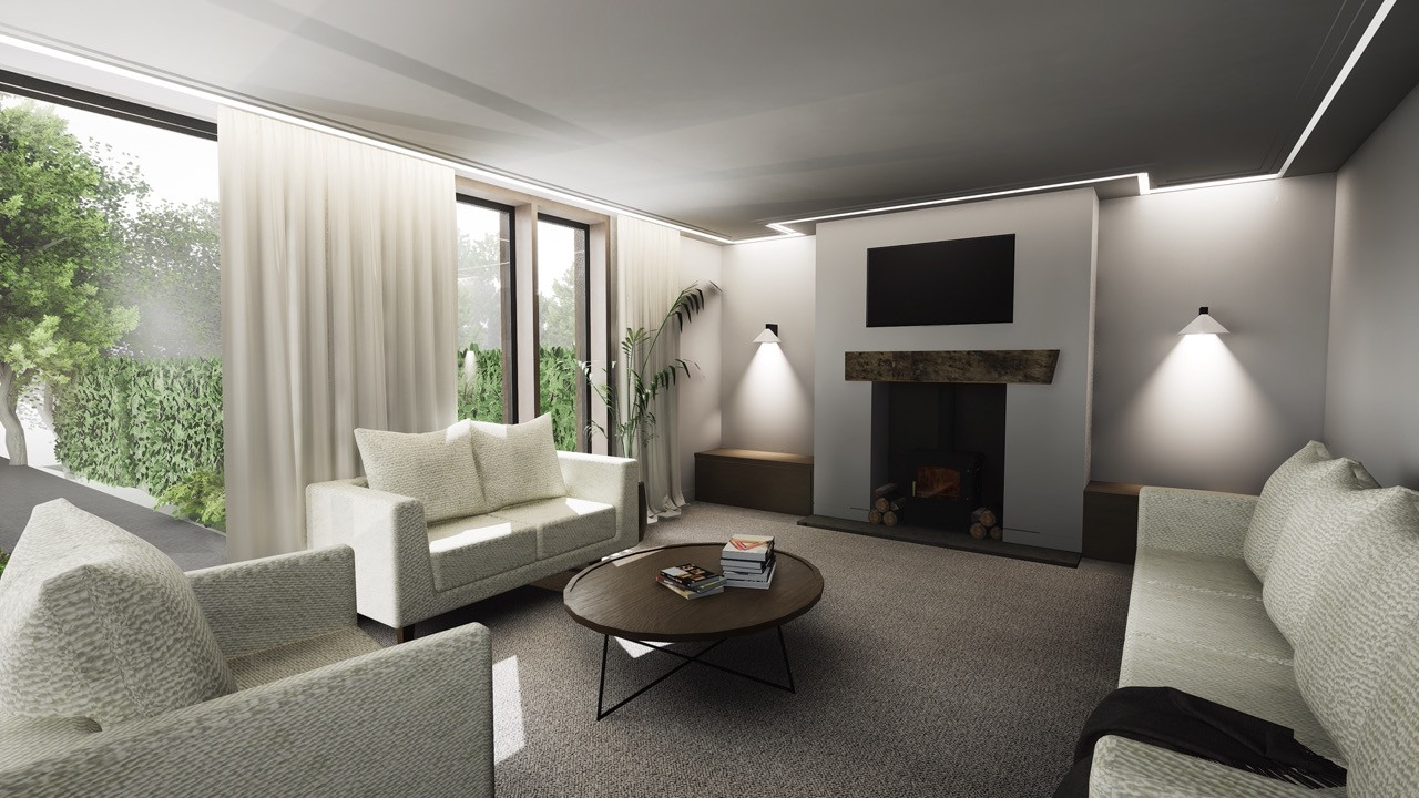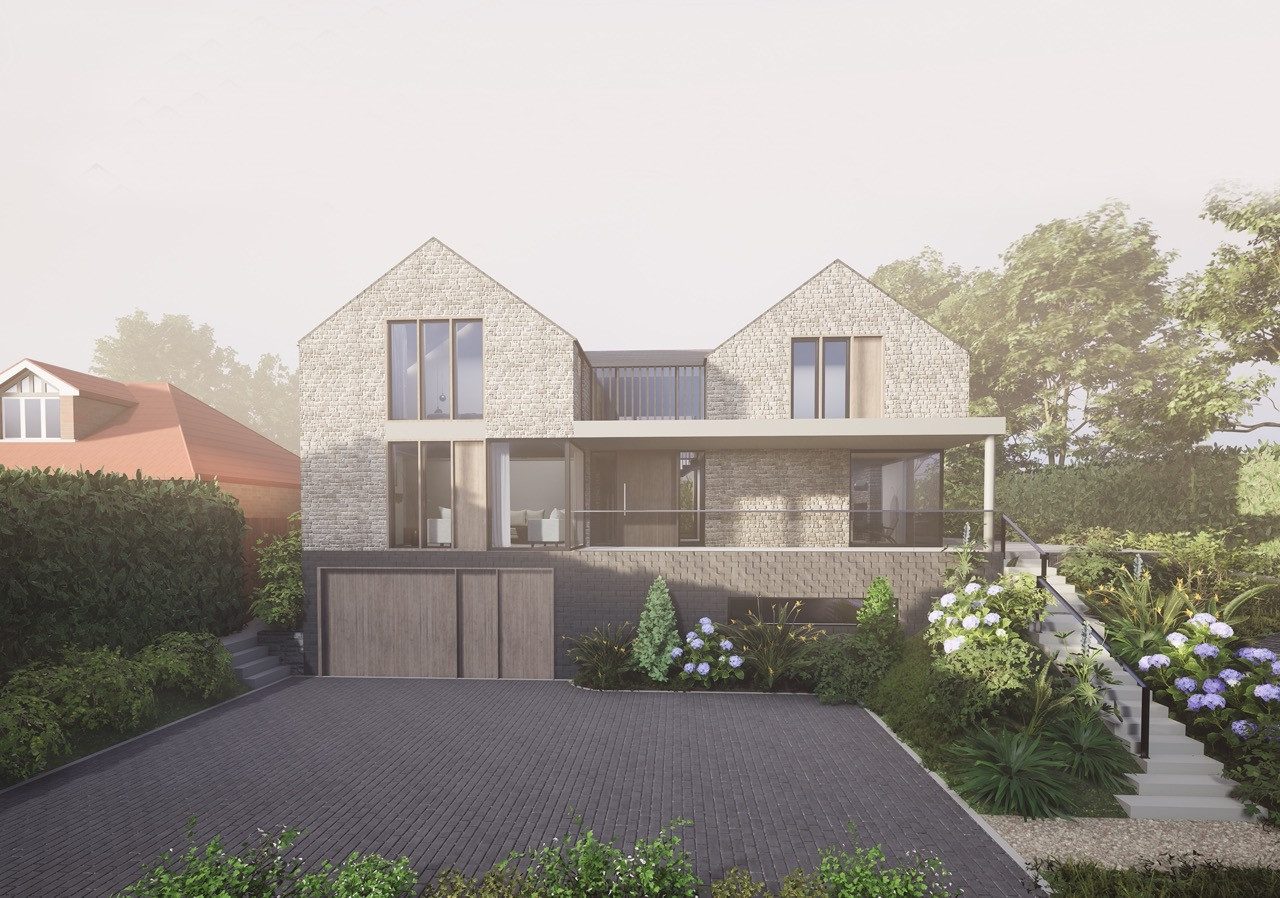The building form is split between two distinct 'wings' separated by a grand staircase. An open plan family space utilises key views across the site, whilst a snug, office and laundry room hugs the boundary adjacent to the neighbouring property.