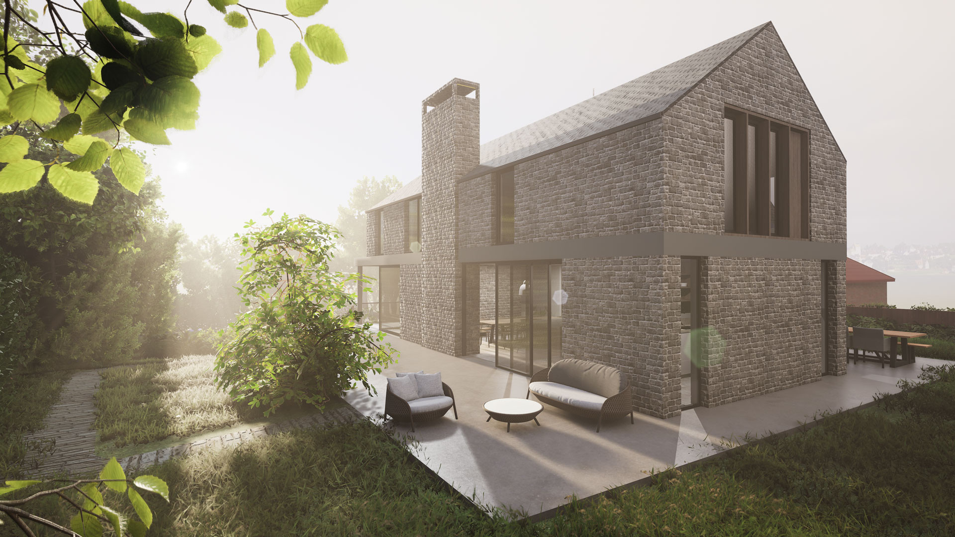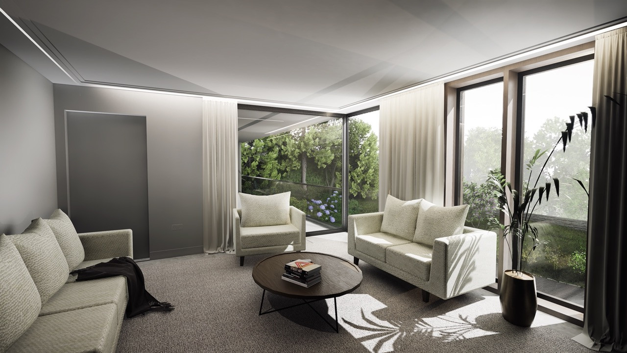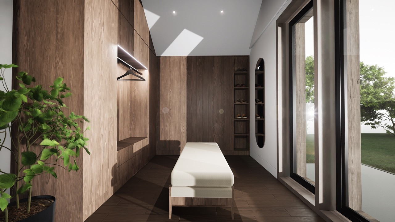 The building form is split between two distinct 'wings' separated by a grand staircase. An open plan family space utilises key views across the site, whilst a snug, office and laundry room hugs the boundary adjacent to the neighbouring property.