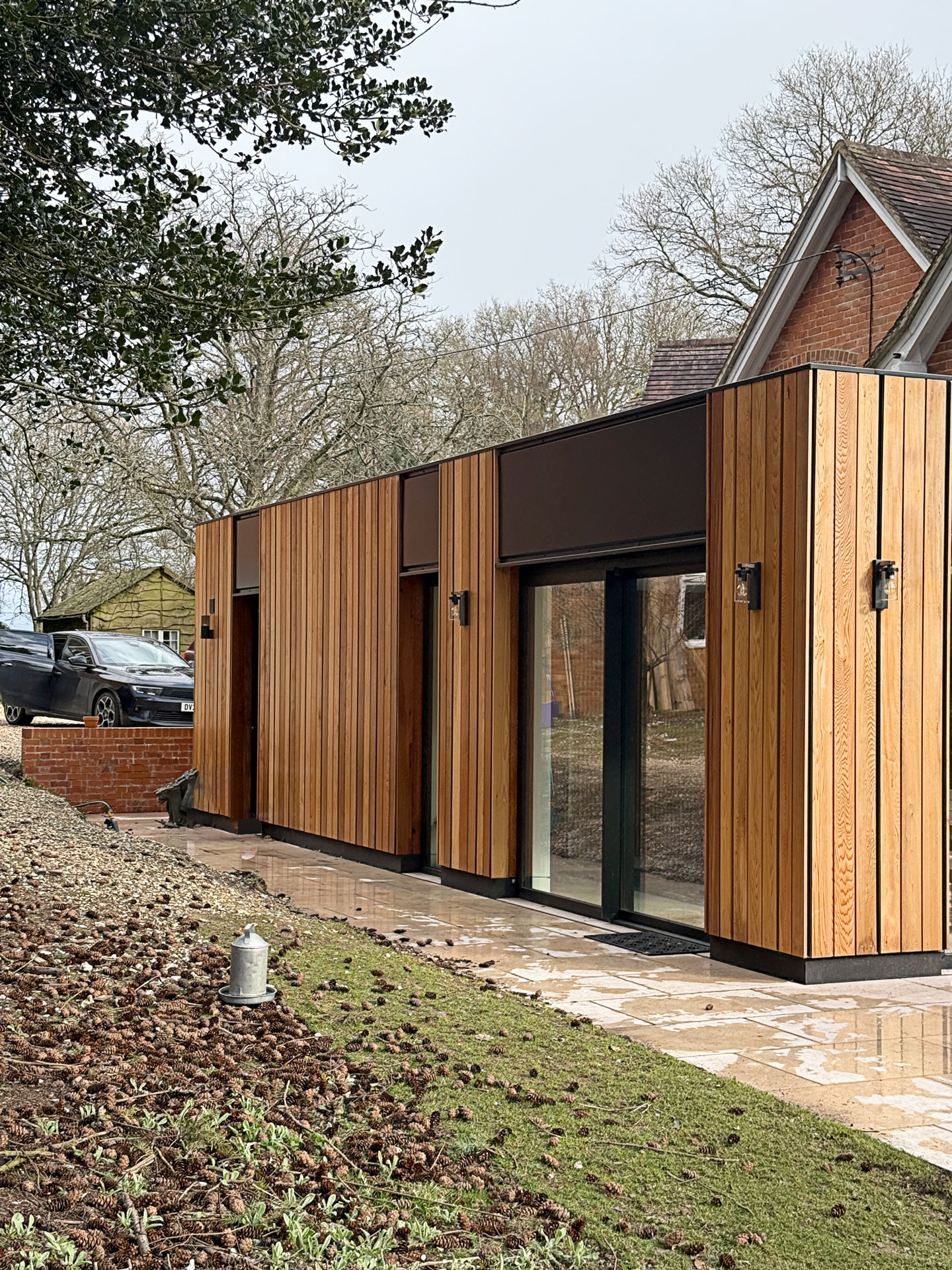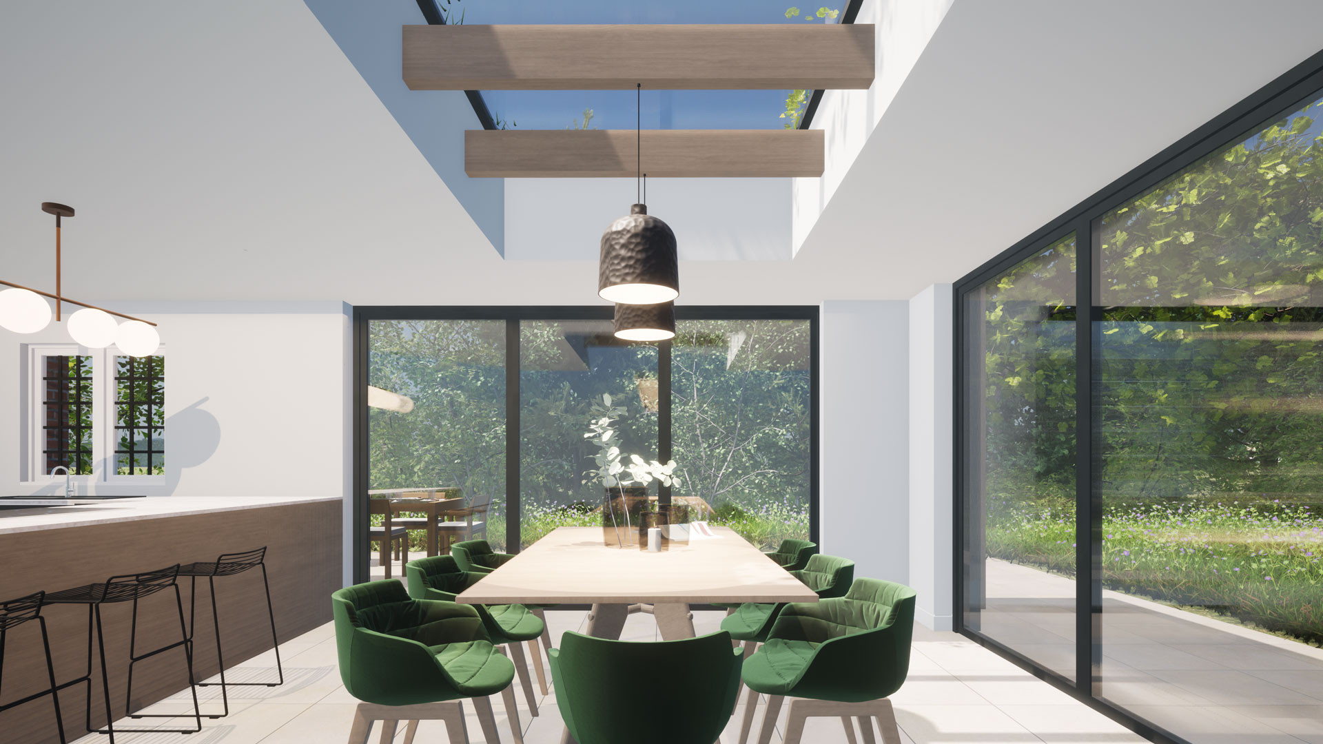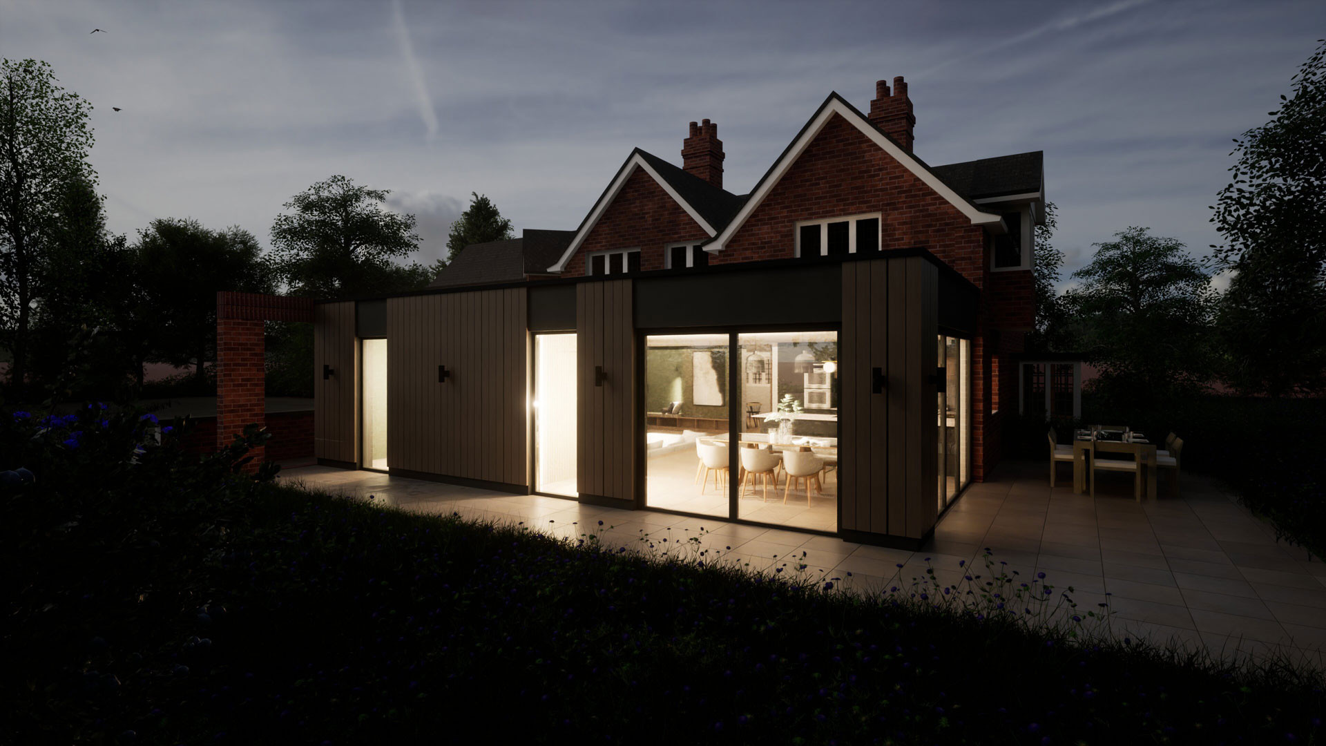 The extension has three active frontages, all responding to key views across the site. The rear facade has larger expansive glazing, opening out onto a new patio space.