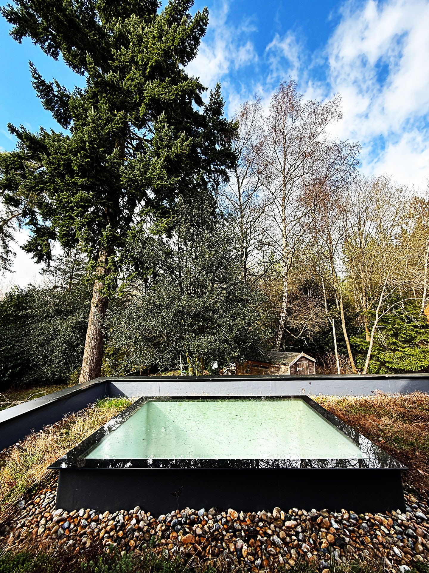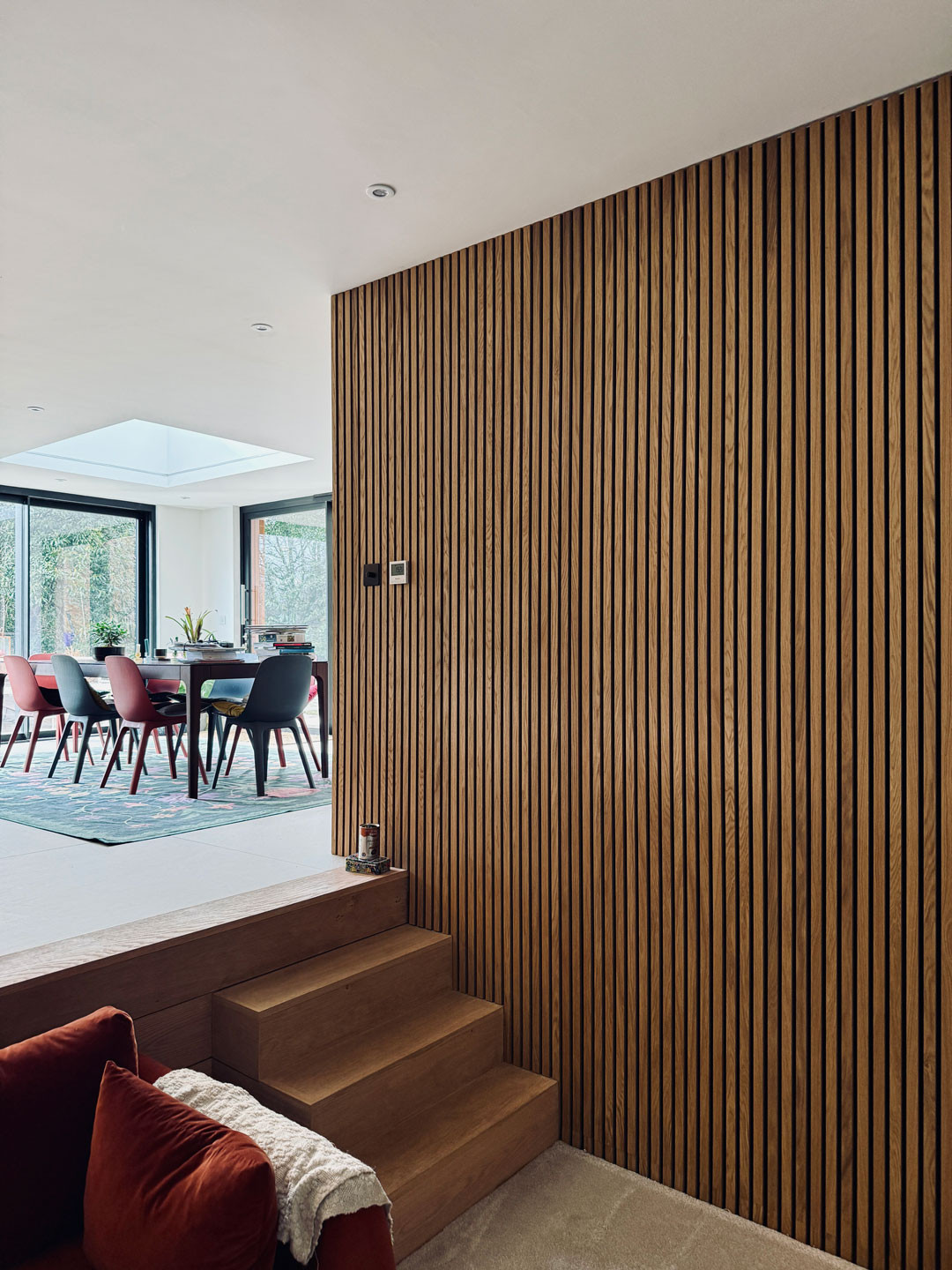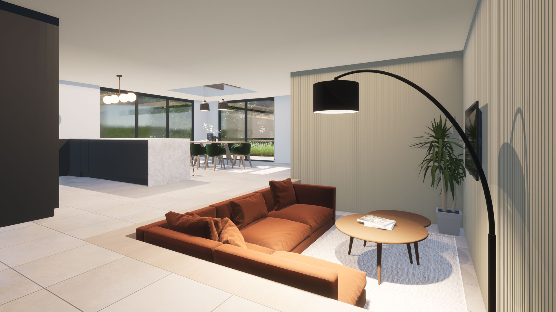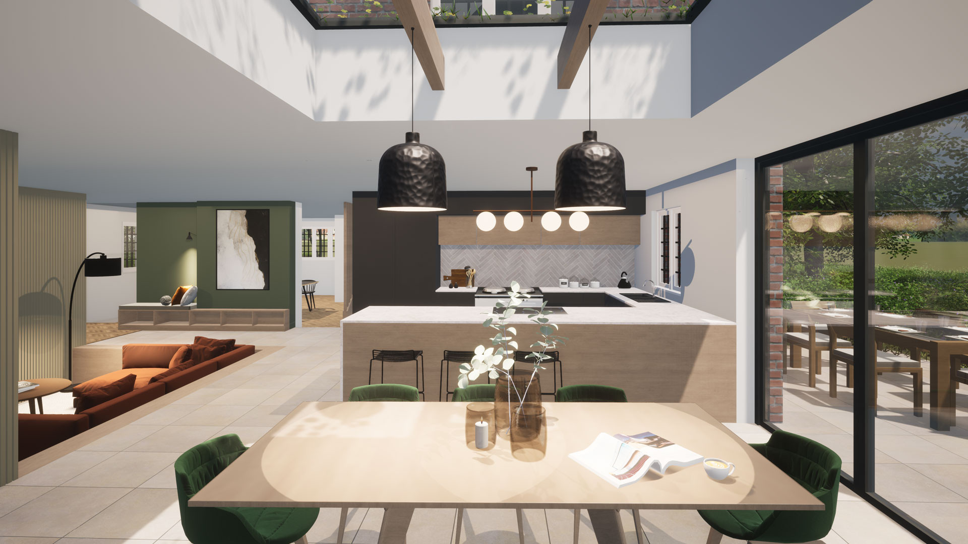 The extension has three active frontages, all responding to key views across the site. The rear facade has larger expansive glazing, opening out onto a new patio space.