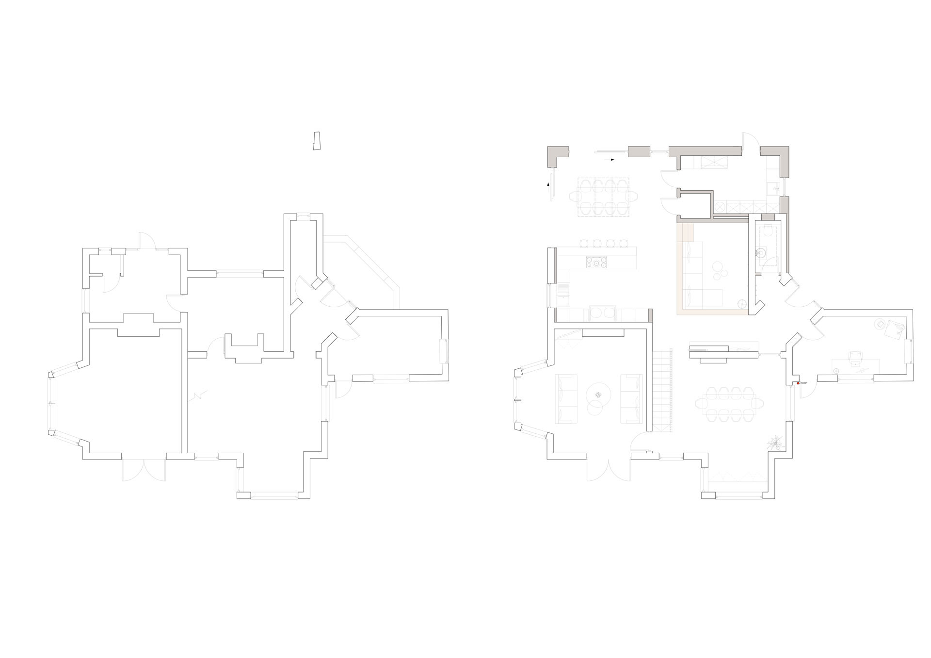 The material palette focuses on applying natural materials to the new 'additions' of the property, which juxtapose the existing red brick.