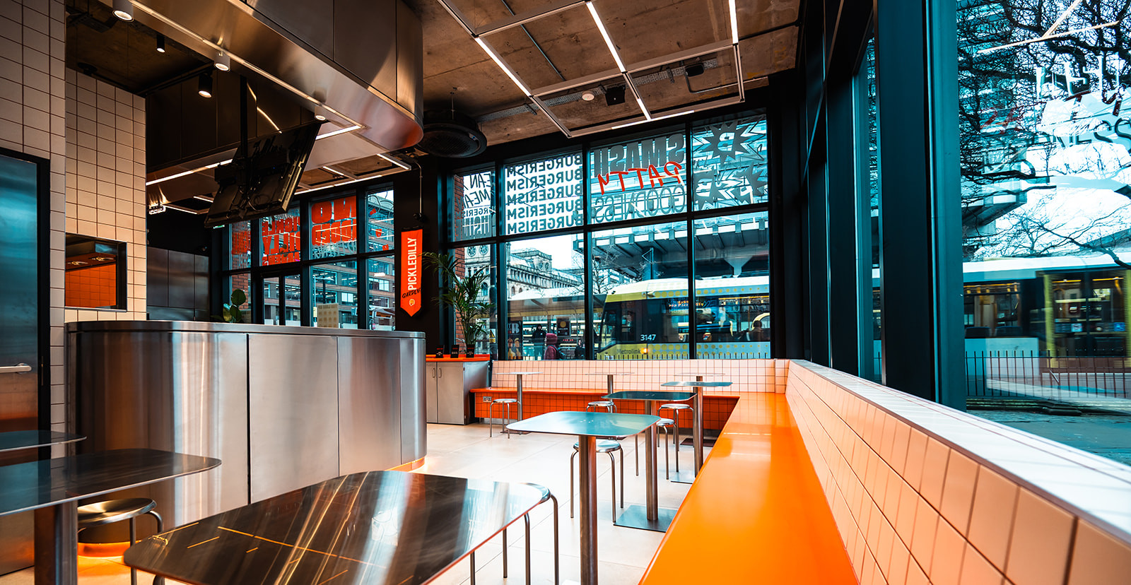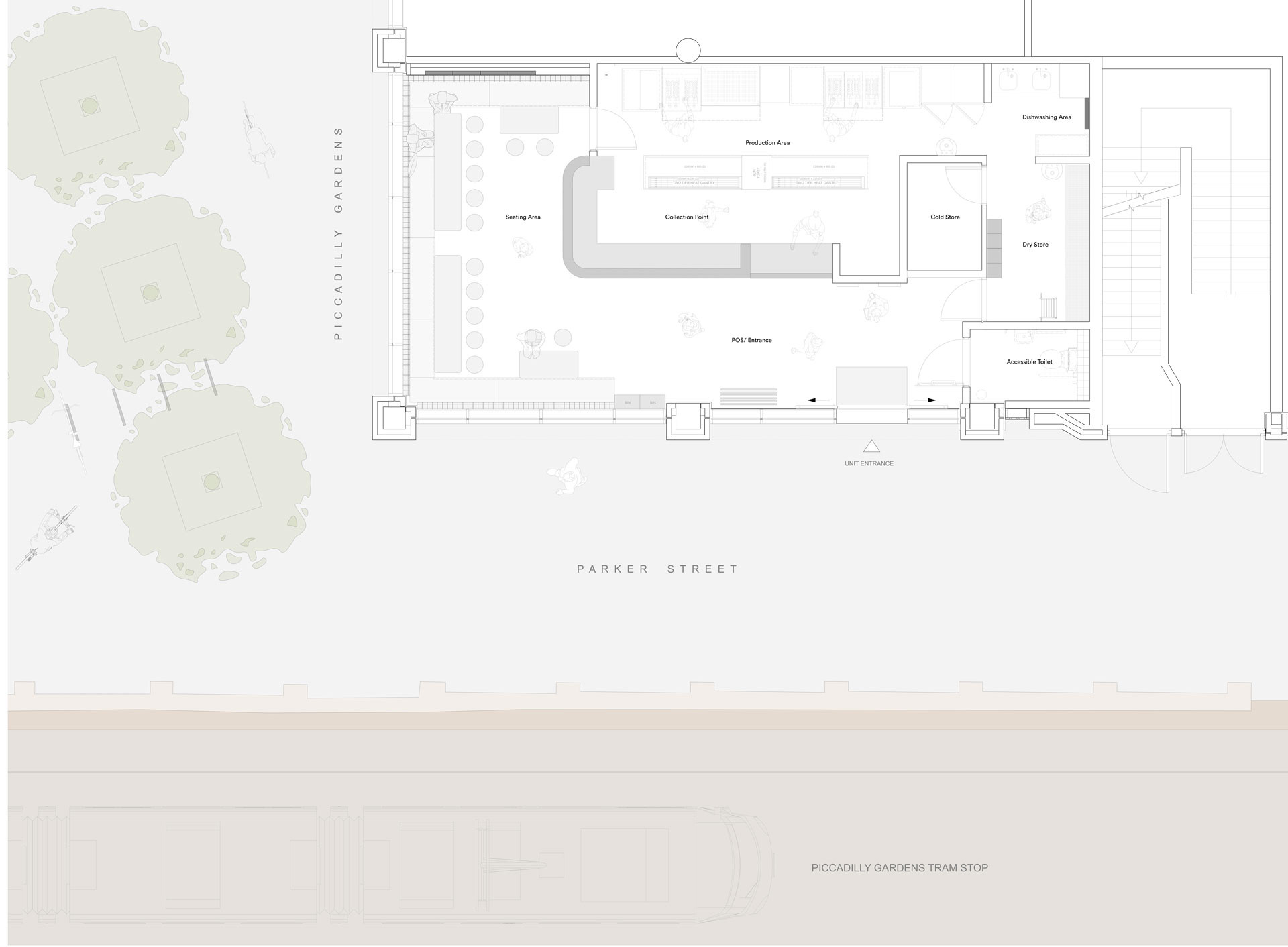 The seating area offers views of Piccadilly Gardens, with seasonal foliage softening the boundary between interior and exterior, enhancing the connection to the surrounding environment. An asymmetrical, U-shaped counter with a gentle curve subtly directs foot traffic, creating a smooth transition from ordering to seating while contributing to the overall spatial rhythm.