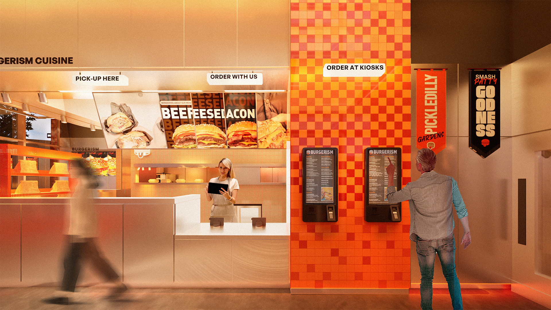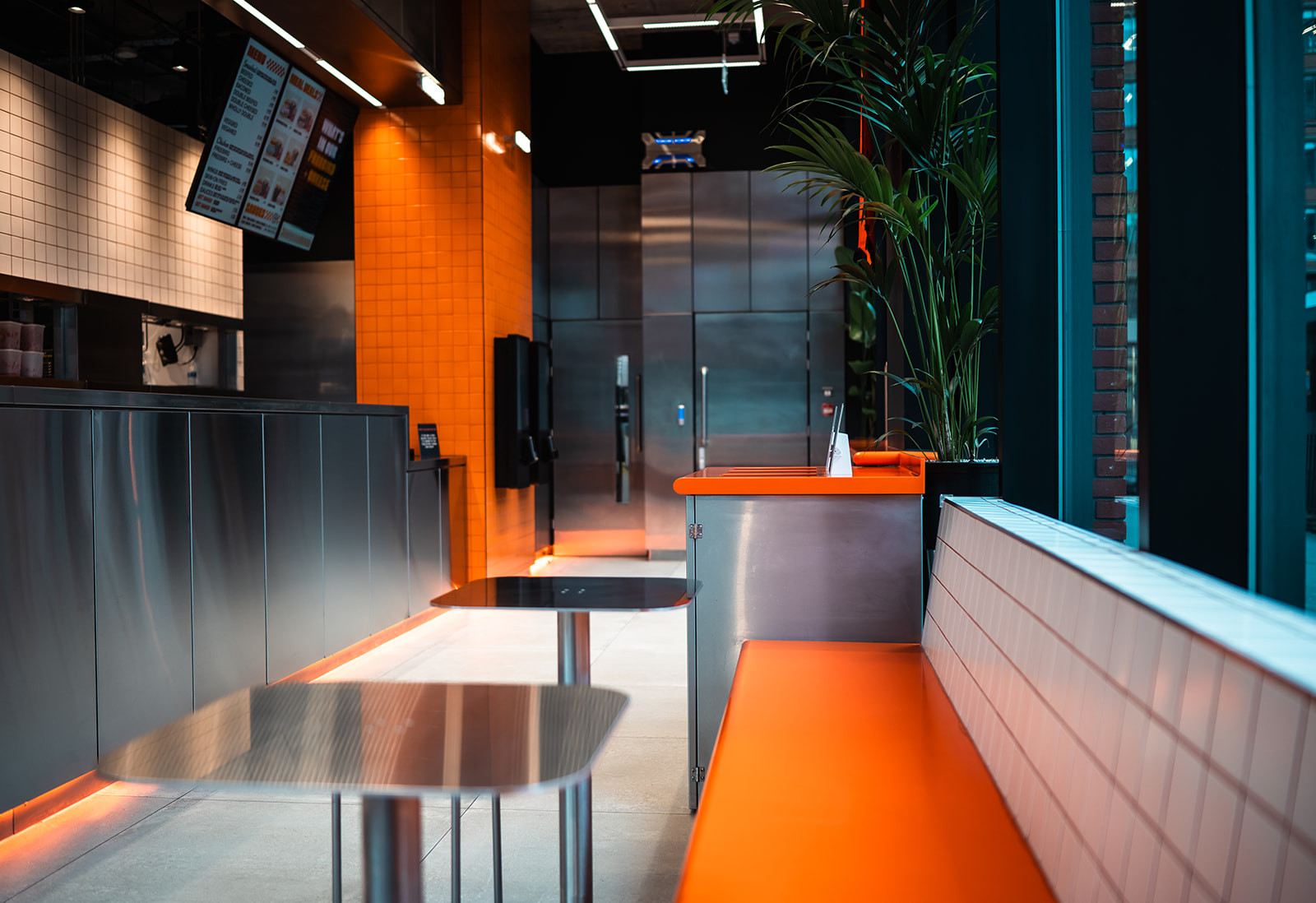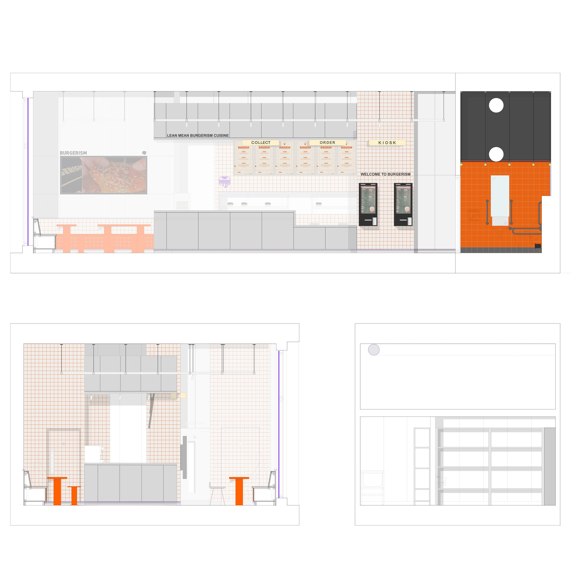 The layout establishes a clear division between public and private areas, ensuring both functionality and flow. Upon entry, the self-service kiosk and POS counter immediately guide customers through the ordering process, leading naturally to the seating area at the rear of the unit for a relaxed dine in experience.