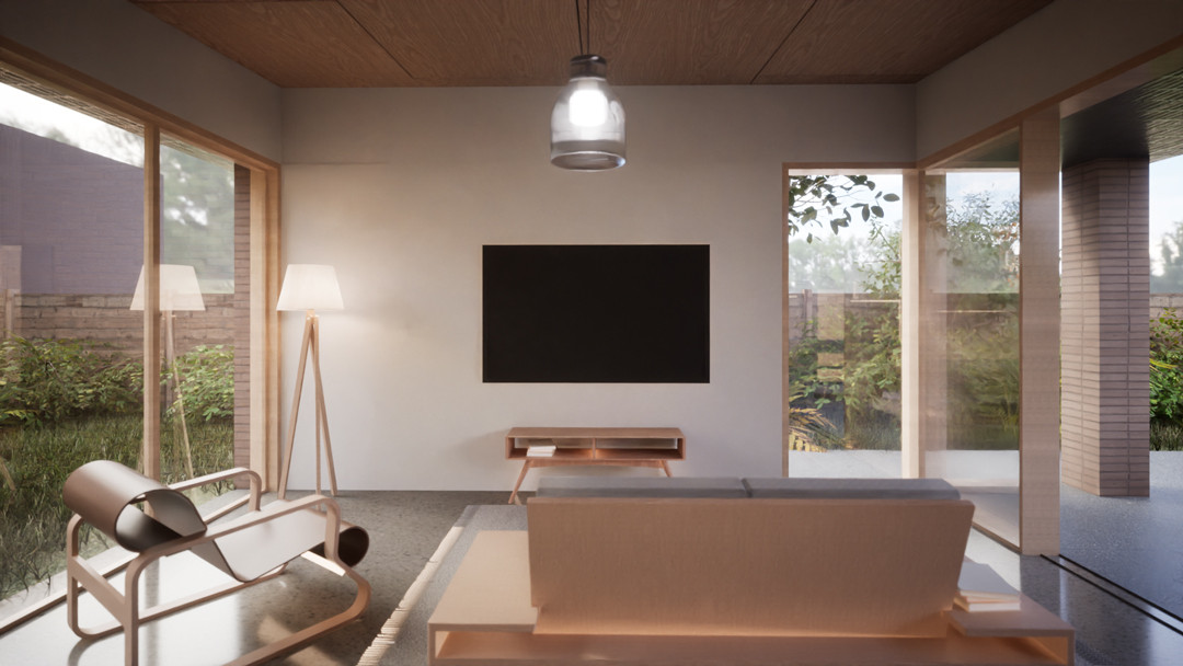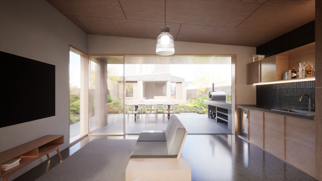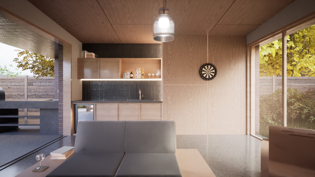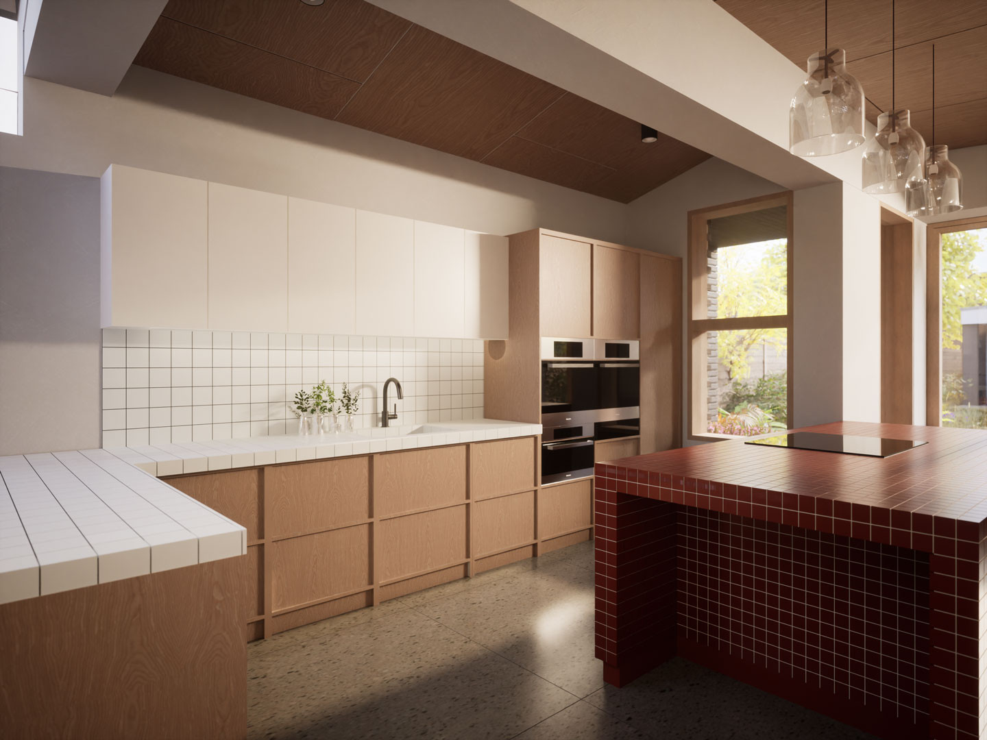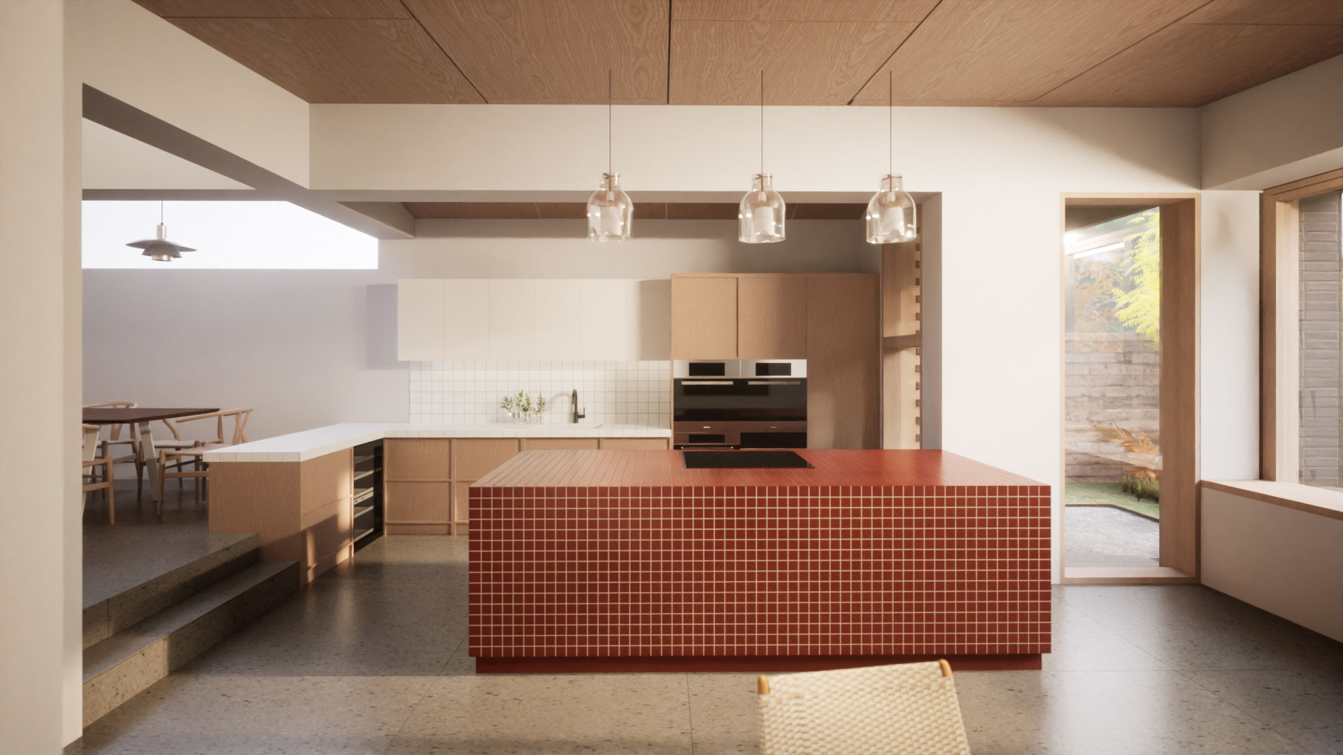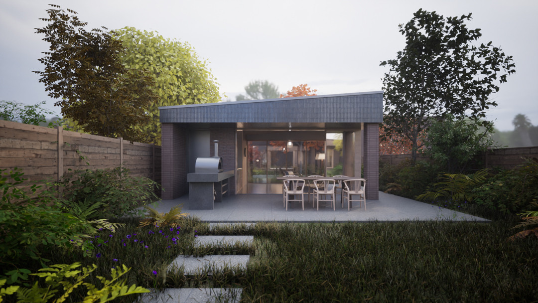 Externally, the facade features deep recesses created by stack bonded brickwork piers, each serving a different purpose. A large framed window and raised planter creates a direct view over the wildflower garden from the living space, an internal/external window seat connects the kitchen to the garden, whilst the set back in the extension allows direct access to the rear of the property.