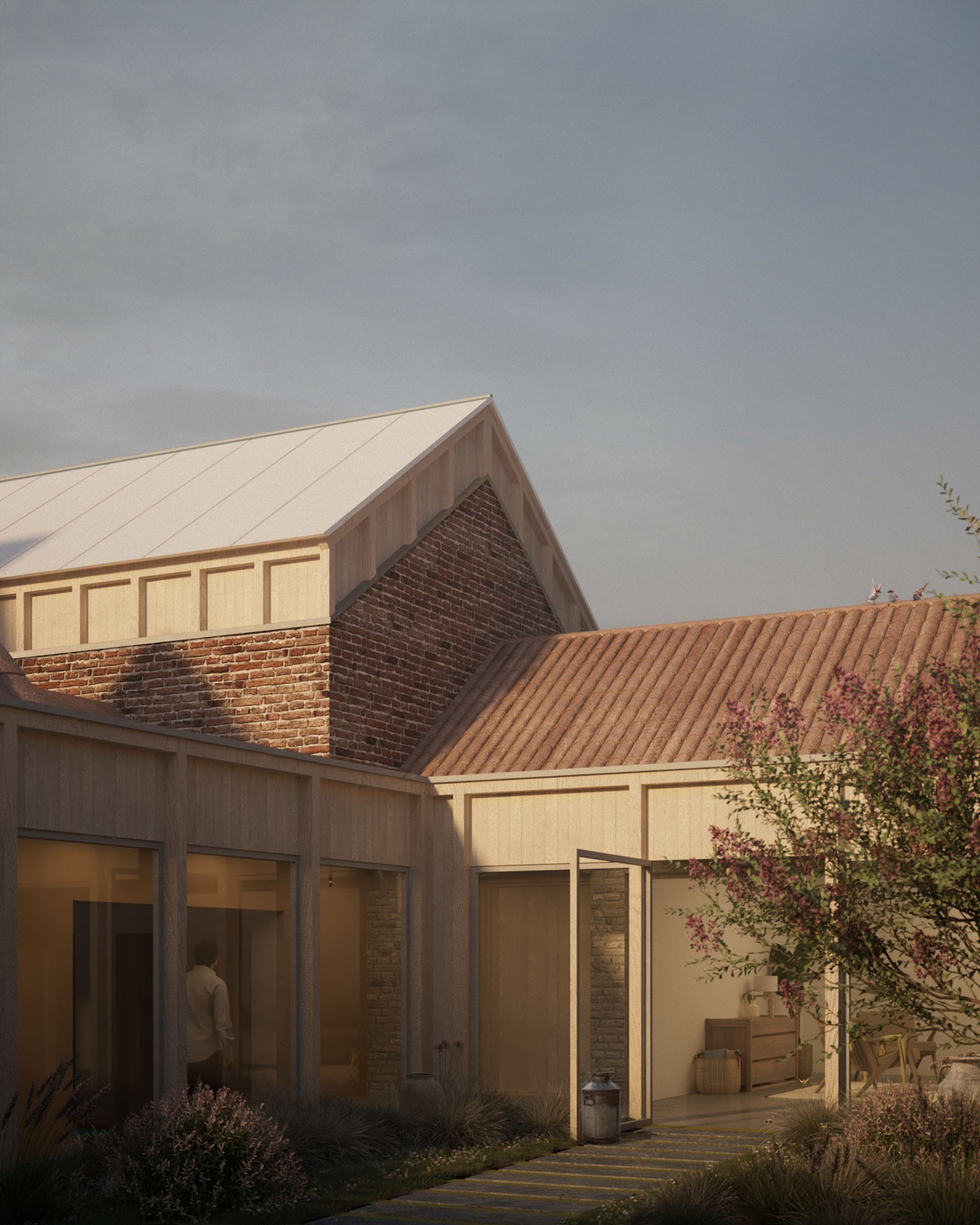 The programme is to fully restore the brick barns and stables, both internally and externally, and to add a contemporary extension to the south-west including an open plan kitchen/living space and the principal suite. The extension frames the views of the surrounding landscape, brings natural light deep into the building, and will increase the home to 9000sqft.